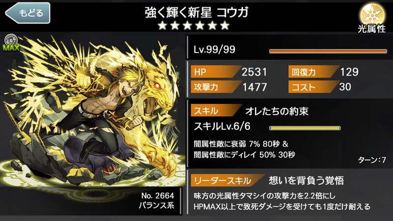 | 詳細 | 味方の光属性タマシイの攻撃力を2.2倍にし HPMAX以上で致死ダメージを受けても1度だけ耐える |