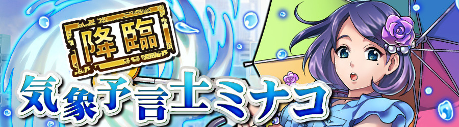 | 水 | ★5 | 気象予言士 ミナコ HP:600,000 防御力:8,000 | 3バトル目固定出現 ★4気象予報士 ミナコ 確定ドロップ |