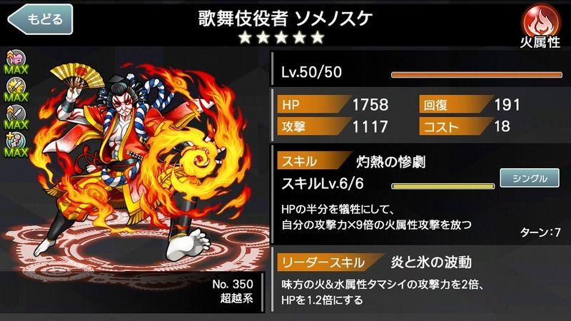 | 詳細 | 味方の火&水属性タマシイの攻撃力を2倍、 HPを1.2倍にする |