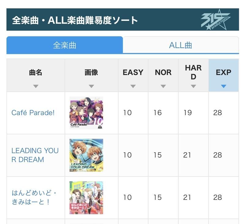 - 「難易度ソート」においての EASY/NOR/HARD/EXP はそれぞれ EASYレベル/NORMALレベル/HARDレベル/EXPERTレベル を表します。