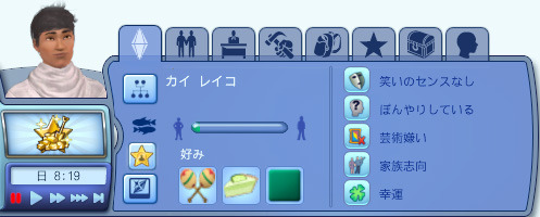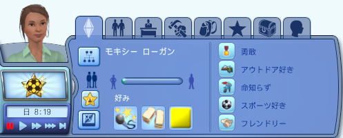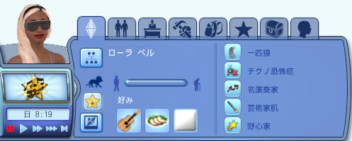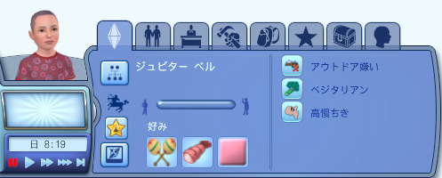 | スキル | ガーデニング:2、スポーツ:2、Club Dancing(隠):3、踊る(隠):1、ダイビング(隠):2、テーブルサッカー(隠):1 | |