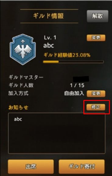 ギルド名を変更したい場合、ギルドロビー画面の右側に表示されるギルド情報のギルド名横の「変更」より、変更が可能です。