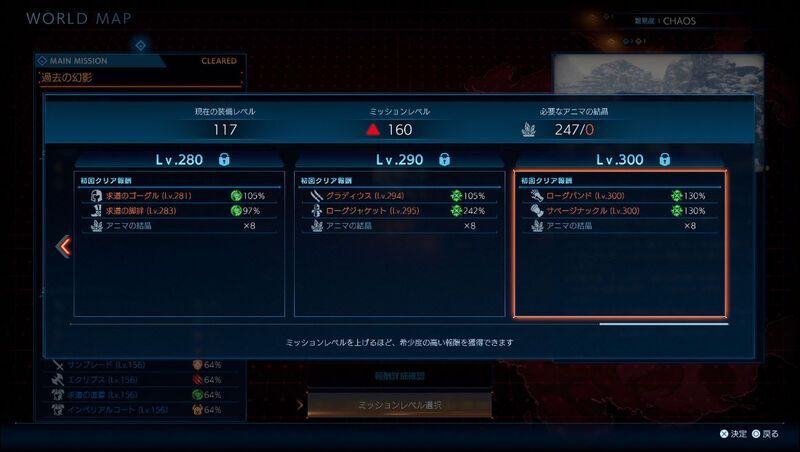 | Lv.300 | 247 | ・ローグバンド(Lv.300)x1 ・サベージナックル(Lv.300)x1 ・アニマの結晶x8 |