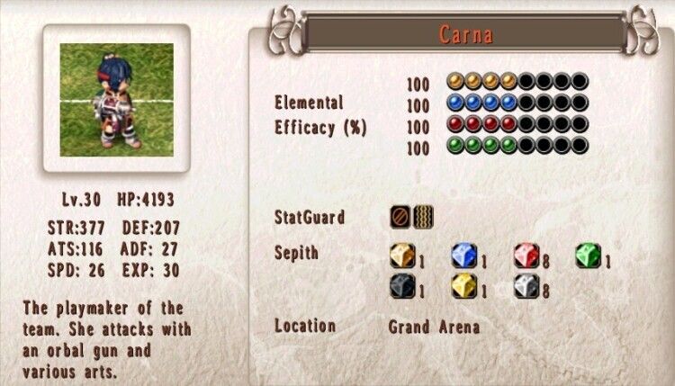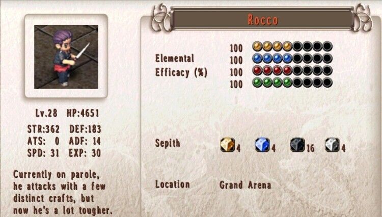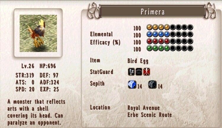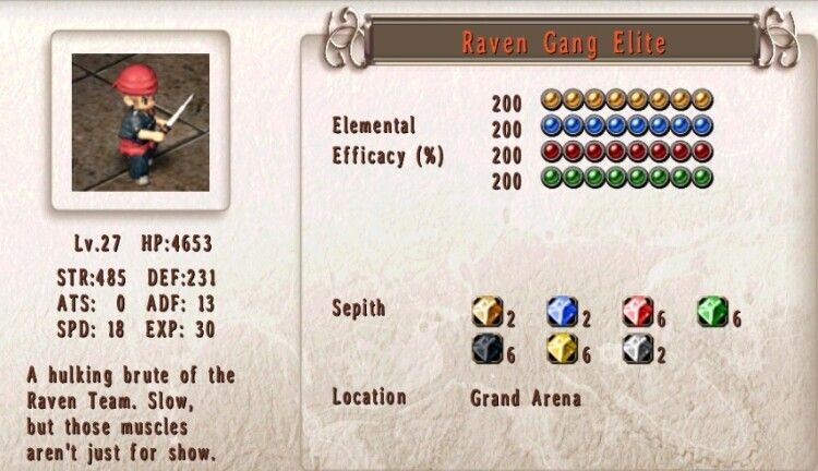 これらの敵は以前遭遇した時よりも強力になっていますが、それ以外の技構成は同じです。エリートは4属性全て(200)に弱く、他の3体は中立です。状態異常耐性はありません。また、エリートは攻撃しかできません。他の3体は、回復、STR上昇、蘇生、防御力低下、封印、そしてチャージアップで必殺技を付与するクラフトを持っています。