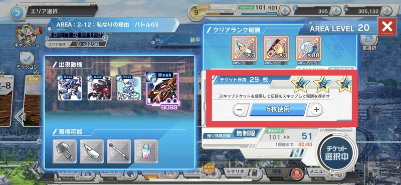 クエストに挑戦する際、すでにクリアランク達成条件を全て獲得している状態(星3つ)であれば、スキップチケットを使用することでバトルを省略し、報酬を獲得することができます。