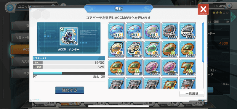 ACCMを強化する事で、ユニットのパラメーターの強化にも繋がるので、余ったコアパーツは強化に使っちゃいましょう。