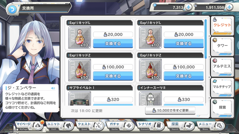 交換所ではキャラクターのレベルアッに必要なEXPリキッドや各種強化素材をクレジットと交換する事ができます。