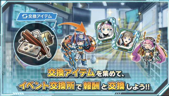 | 概要 | 【イベントの流れ】 ・イベクエ周回で交換アイテムを集める ・イベントミッションクリアで報酬を獲得 ・集めた交換アイテムを報酬と交換 ・交換所でユニットチップを入手できる ・特殊ルールランキングバトル開催 |