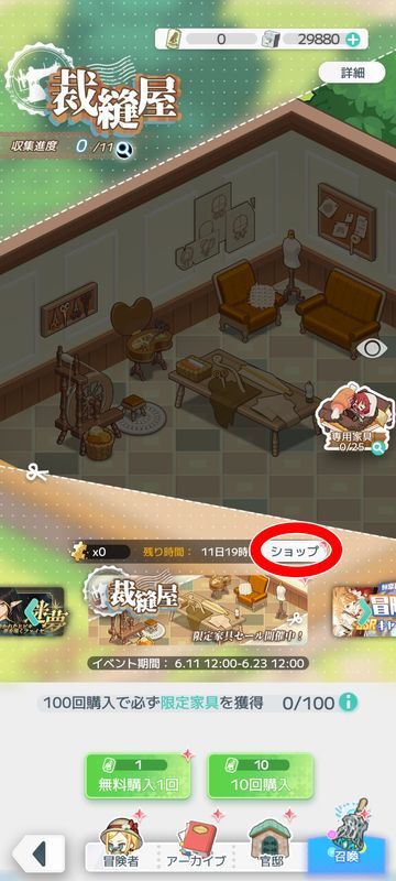 「家具ショップ」「限定パック」では無料限定家具券を獲得することができます。