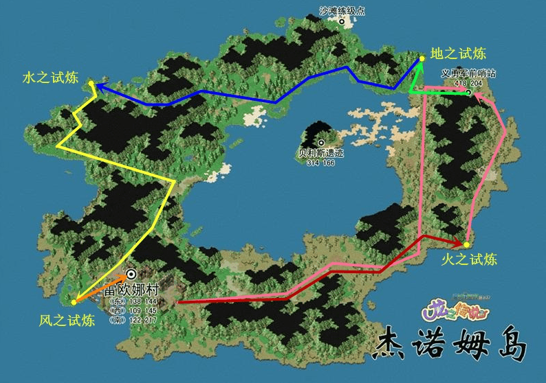 ◆推薦行走線路:雷歐娜村→義勇軍前哨站→地之試煉→水之試煉→風之試煉→火之試煉→義勇軍前哨站(中間任意箭頭處可登出回城補給)