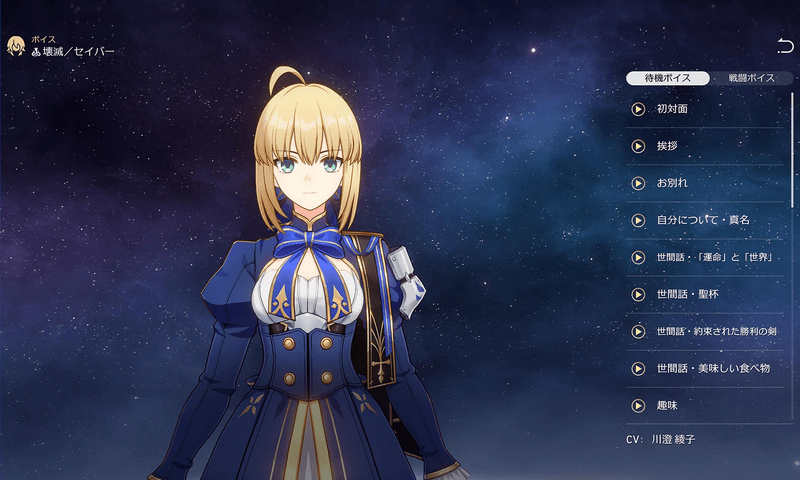 Ver.3.5以降、設定からキャラボイスを切り替えずに、キャラクター詳細→情報→ボイスからコラボキャラクターの待機ボイス、戦闘ボイスそして待機モーションボイスをFate[UBW]公式声優ボイス(日本語ボイス)に切り替えることができます。