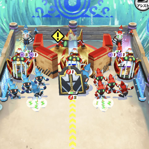 逆にボールが戻って来た時に盾の敵がターゲットへの軌道を塞いでいる場合は、一旦リターンショットを使ってサービスショットで仕切りなおすとタイムロスを防げます。