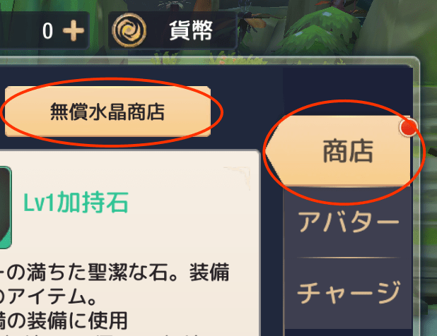 表示されたウィンドウの右側の「商店」をタップし上段右側にある「無償水晶商店」をタップします。
