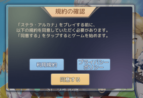 初回プレイ時の規約同意画面が出てくるので同意して進めると初めからプレイできます。