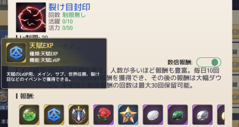 裂け目封印では、多くの経験値だけでなく天賦EXPなど様々な報酬を受取ることができます。1日に規定数まで経験値が8倍もらえるので必ず毎日挑戦しておきましょう。