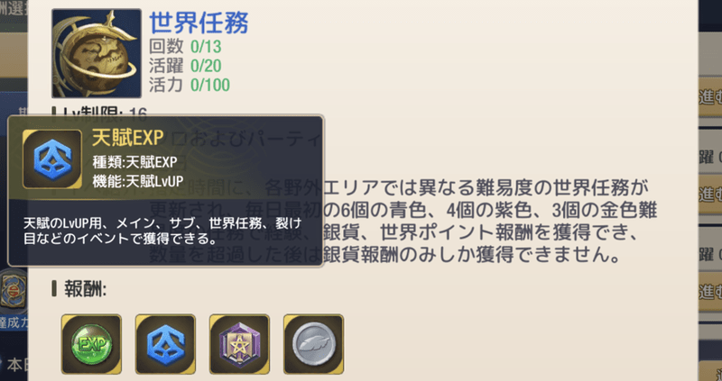 メイン任務やサブ任務、世界任務でも天賦EXPを入手できます。裂け目封印と同様に、毎日挑める数が決まっているのでこまめに挑戦するのがおすすめです。