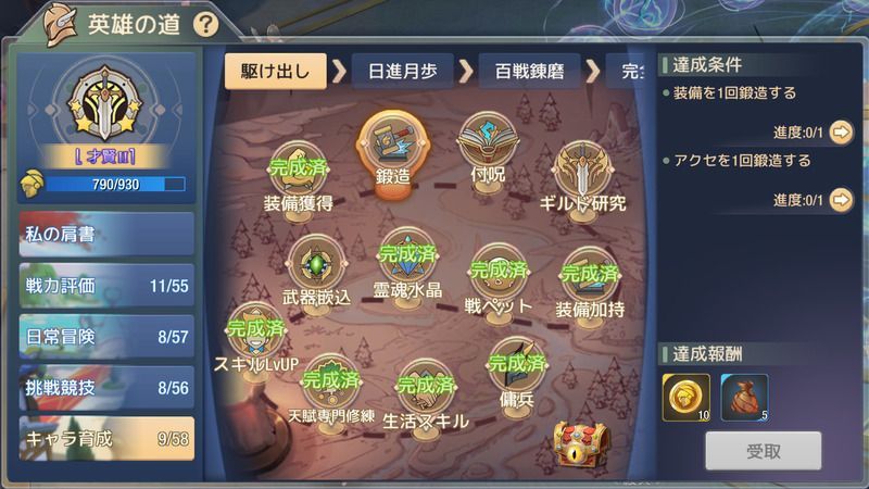 | 鍛造 | 装備を10回鍛造 任意の装備の熟練度が15 青色魔法属性を累計5回鍛造 | 20英雄PT,洗練石×10 |