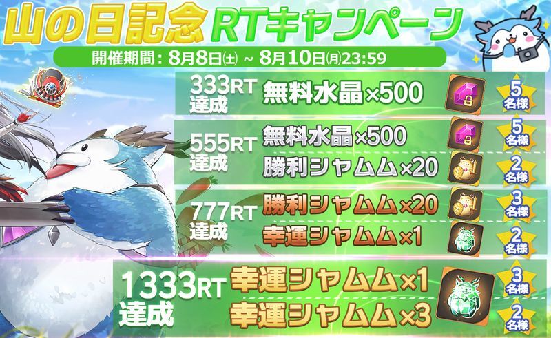 公式Twitterをフォローし、該当のツイートをRTすることで水晶やシャムムなどの報酬がもらえるキャンペーンが開催されています。