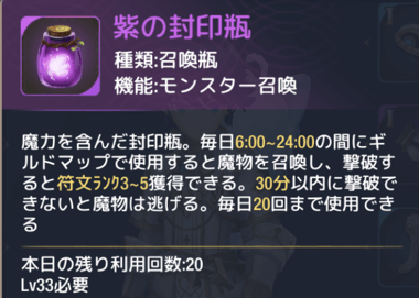 符文は封印瓶を使用した際に現れるモンスターを倒すことでゲットできます。封印瓶は使用時間や毎日挑戦できる回数が決まっているので、注意しましょう。