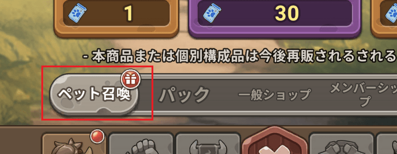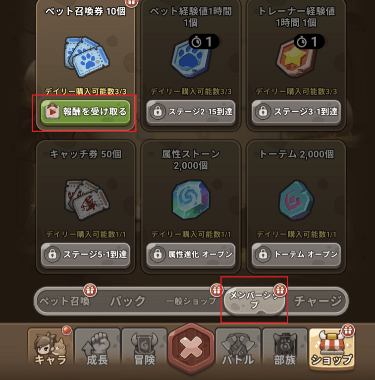 | 3.そのままショップ内「メンバーシップ」に移動し、ペット召喚券10個を3回受け取り、再びガチャを回しに行く。 |