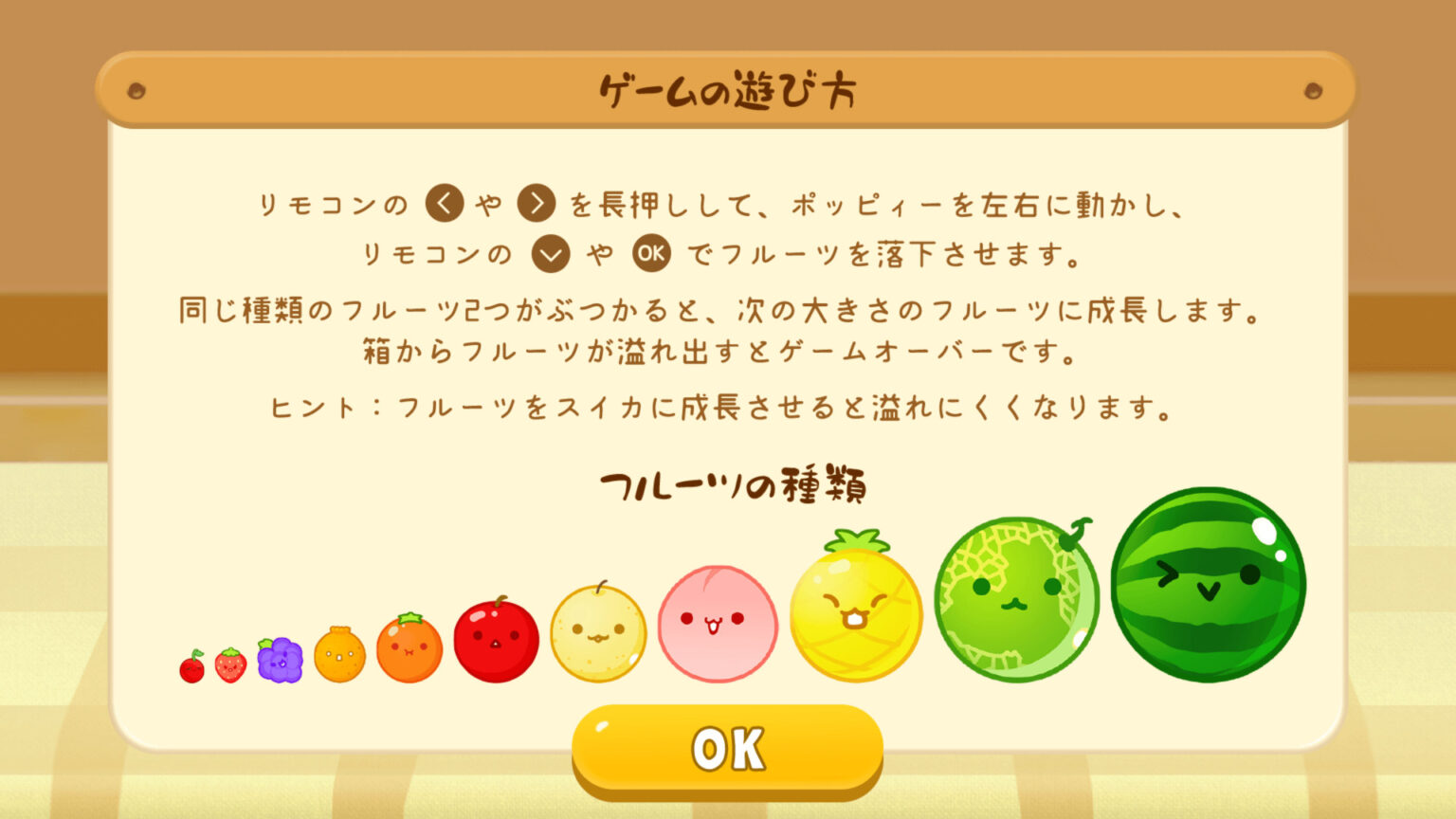 フルーツを進化させたときに、小さいフルーツが上にのっていると、飛んで行ってしまってゲームオーバーになることがあるので気を付けてください。
