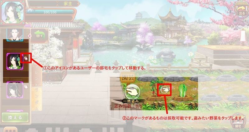 一度に収穫できる「一括盗み」という機能もあります。