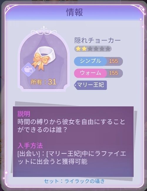 | 秘密の誓い(※1)×5 隠れチョーカー(※2)×5 シルク×32 真珠×19 | ||