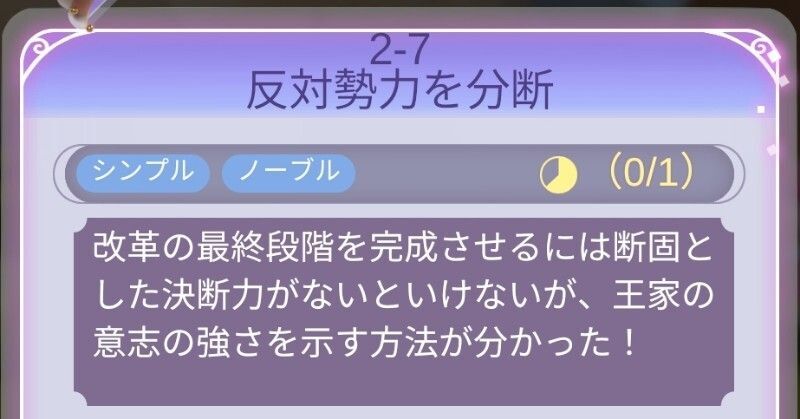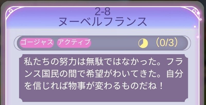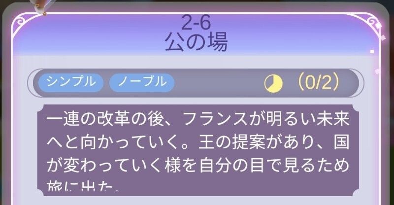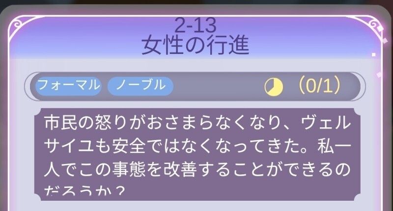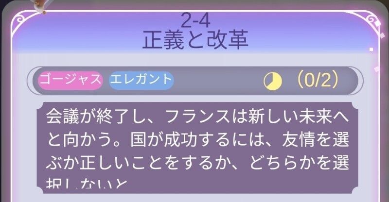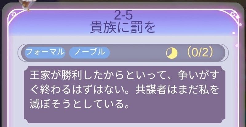 | Perfect攻略 | 新たなヒント衣装の作成が多いが、全てそろえばパーフェクト可能。順調にパーフェクト攻略していれば、耳飾り以外の設計図はそろっている。耳飾りはフェルセンの好感度5必要だが、次の2-15のステージ条件になるため、先に獲得しておくのもオススメ。 |