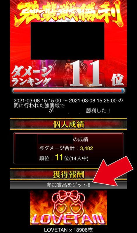ちなみに、もらえるアイテムの内容は自分の「強襲戦」での貢献度(ダメージ数)に応じて変わります。