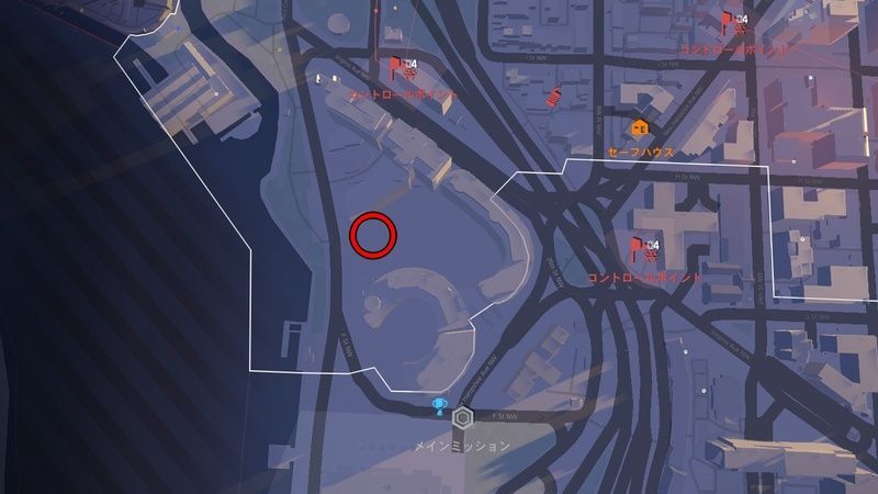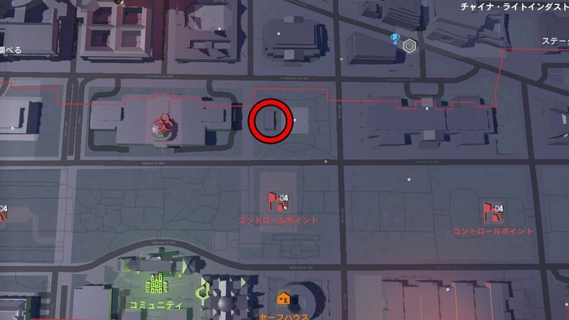 - CP「倉庫」から東、目の前の赤いレンガ上の建物。前作Divisionの最初のセーフハウスへ。(現在はセーフハウスではない)