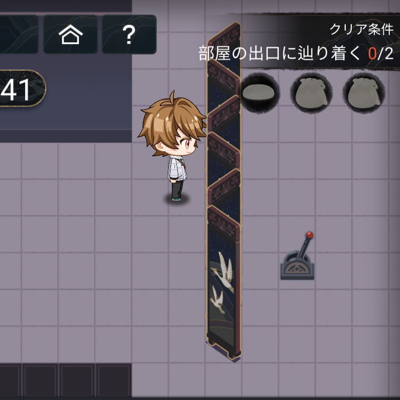 ![]() | 先に進むと衝立の横にレバーがあるので操作する。これは同行者側のヒント入り袋がある部屋の扉を解除するレバー。 操作した後、スタート地点に戻る。 |