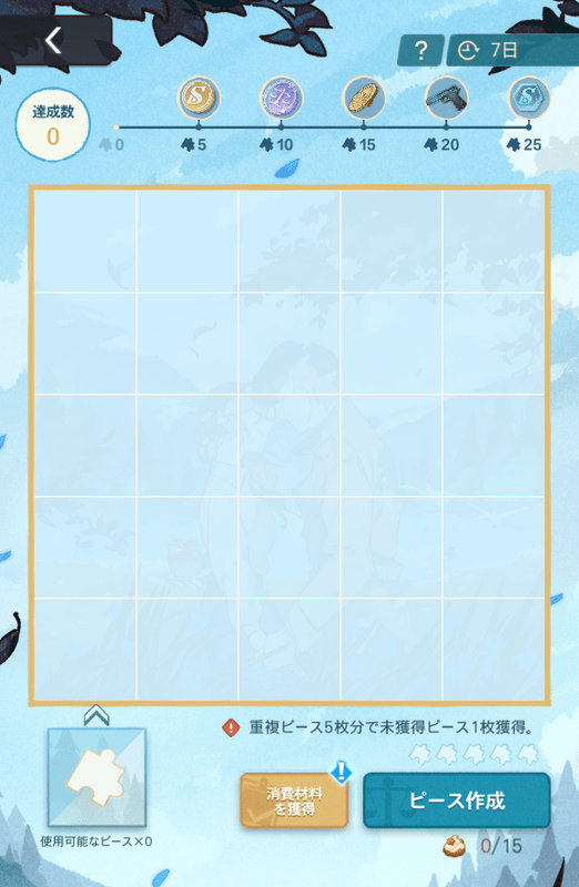 ![]() | ①右下の”ピース作成”をクリック ②左下にピースが表示されます ③表示されたピースを5×5マス内へ配置 ⑤配置があっていると達成数にカウント ⑥達成数に応じて以下の報酬を獲得可能 ※重複したピースが5枚になると、未獲得ピースへ変換されます。 |