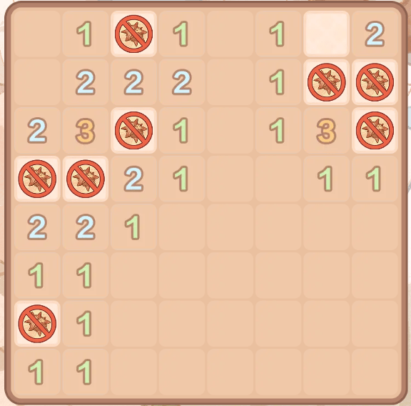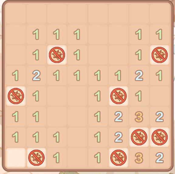 - マスの数字と周囲8マスにいるマークされたオナモミの数が一致している場合、マスをタップすると周囲の綿を一度に集めます。