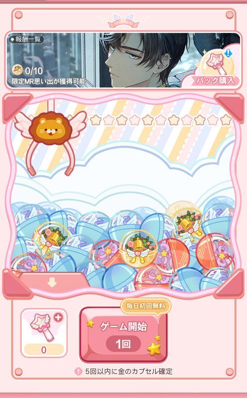 - 「星願の魔法ステッキ・赤」を使いクレーンゲームをプレイしてカプセルを獲得します。