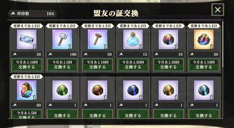 「盟友の証」は商店内にある「盟友の証交換」でアイテムと交換することができます。