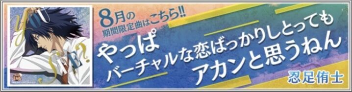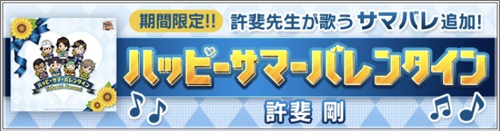 ▽08/14(15:00)~08/31(20:59)▽![]() 『ハッピーサマーバレンタイン』新規実装(全3曲) (丸井ブン太) (木手永四郎) (丸井ブン太&木手永四郎) | |
