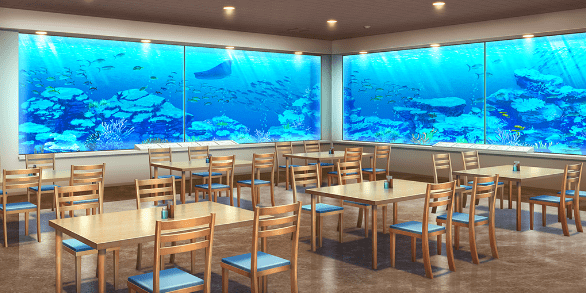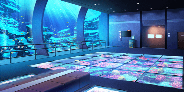 | 博物館内(昼) | 水族館のトンネル水槽(昼) | 水族館の水槽(昼) | コスモス畑(昼) |