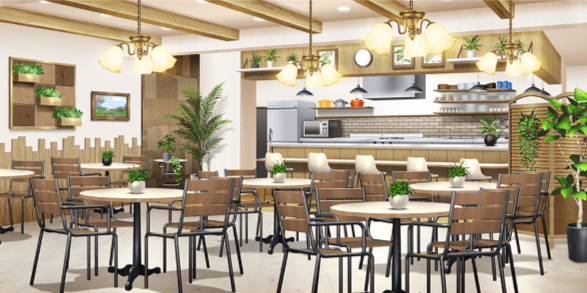 | 東屋(昼/DIY) | エントランスホール(夕) | トレーニングルーム(夕) | オープンテラスのレストラン(昼) |