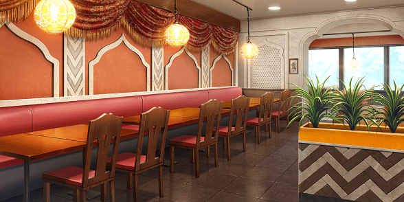 | お笑いステージ(昼) | バレンタインパーティー会場(照明OFF) | バレンタインパーティー会場(照明ON) | インドカレー屋(照明ON) |
