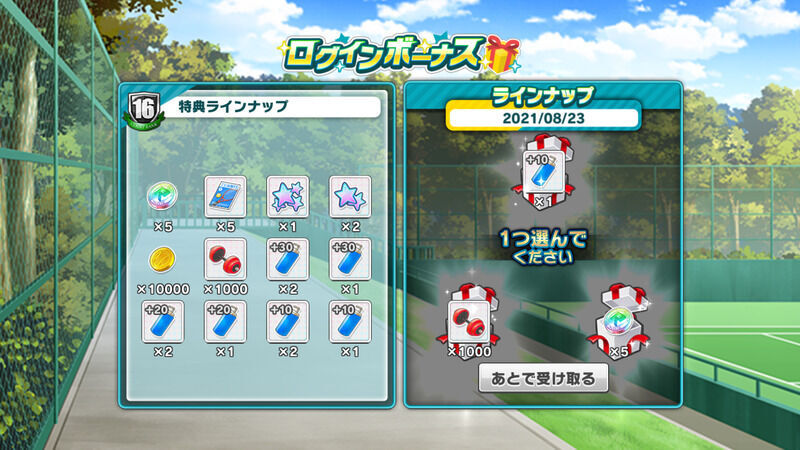 | ※「ログインボーナス交換券」は「あとで受け取る」を選択した日の「コートランク別ログインボーナス」の報酬を任意のタイミングで受け取れるものであり、コートランク変動後に使用しても、変動後のランクの報酬がもらえるわけではない | |