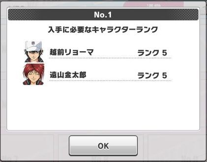 | 榊太郎(vol.1) | 415 | 試合終了後、氷帝学園中等部のキャラランク獲得値が10%アップ | 「新テニスのおじ様 RisingBallade」交換報酬 | |