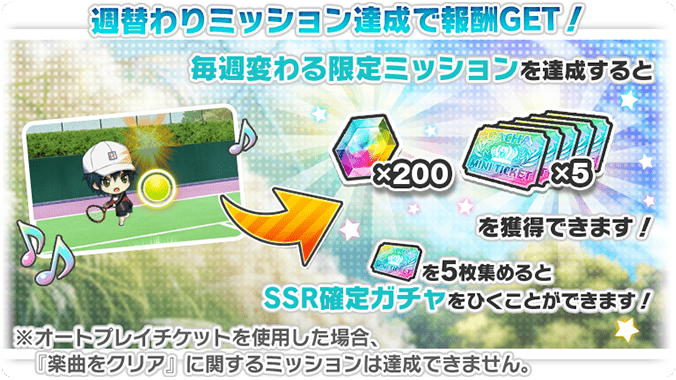 - 期間限定ミッションを全てクリアすると、「ビートストーン」×200と「SSR確定ガチャミニチケット」×5枚獲得可能