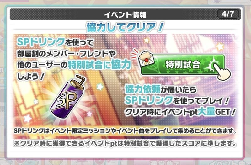 | ・協力するには「SPドリンク」が必要 「SPドリンク」はイベント曲でのドロップやミッション報酬で入手 |