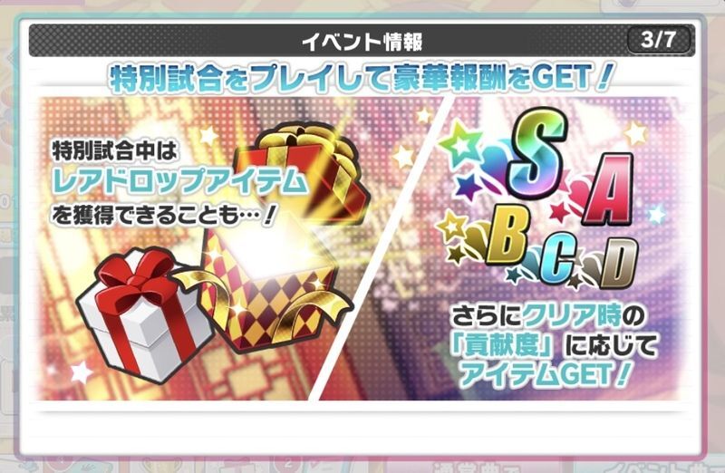 | ・特別試合では集めたスコアに応じてS,A,B,C,Dで貢献度を判定。クリア時に貢献度に応じたアイテムをゲット |