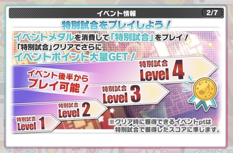 通常楽曲をクリアすると消費APや運に応じてメダルがもらえます。そのメダルを使ってイベント限定曲・特別試合をクリアしポイントを稼ぐイベントです。
