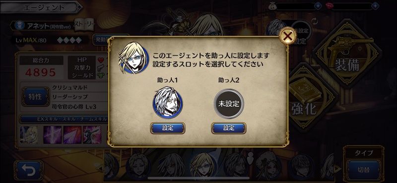 フレンドや他のプレイヤーに提供する助っ人を設定するには、トップページ>エージェントからエージェントページに移動する。