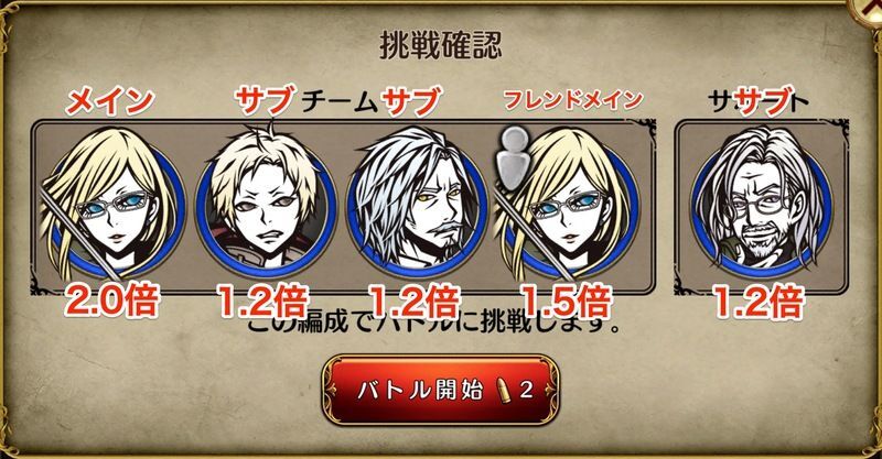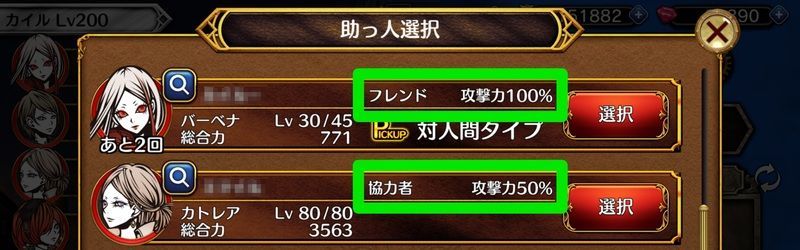 フレンドではないプレイヤーの助っ人(協力者)を使うと攻撃力が半減してしまうが、フレンドまたは大部隊メンバーの場合は攻撃力100%で使うことができる。