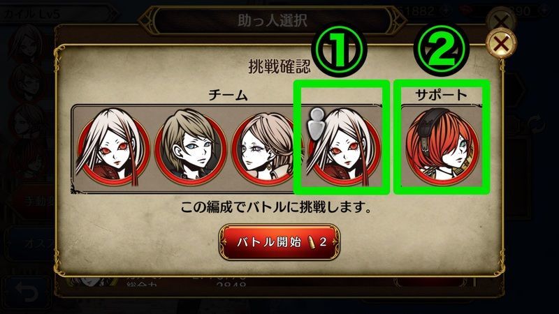 助っ人がチーム4番目に入り①、編成で4番目に設定していたキャラクターが『サポート』枠②に入る。『総合力が低い』『有利タイプではない』といったキャラクターを編成する場合は4番目に設定しておくといい。