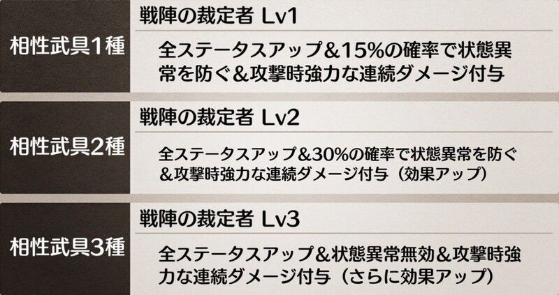 | Lv3 | +30% | 状態異常無効 | 基本攻撃力×0.5 |