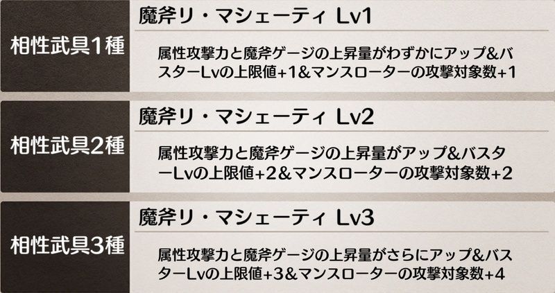 | 相性特性 レベル | 属性攻撃力 | バスターLv 上限値 | マンスローター 攻撃対象数 |